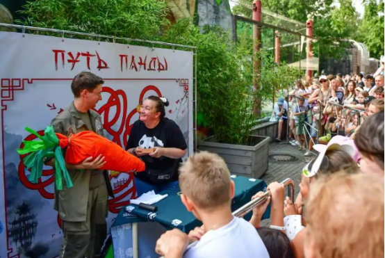 7月30日,一场精彩的舞龙表演从莫斯科动物园的入口处开始,一路引导着游客们来到熊猫馆。游客们有的头戴熊猫发箍,有的身着熊猫T恤,脸上洋溢着欢快。