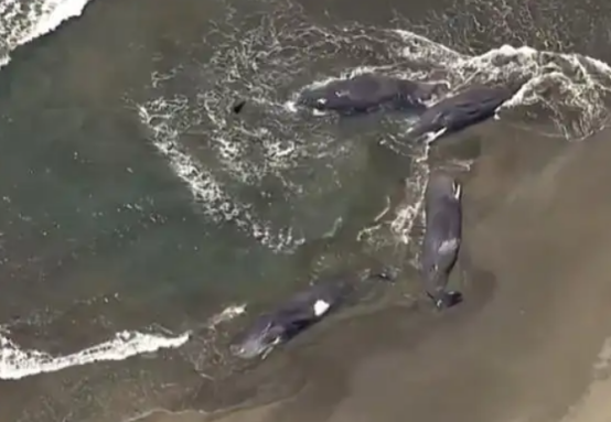 据报道,在日本千叶县馆山市的平沙浦海岸出现罕见的情况:有4头鲸鱼集体搁浅在沙滩上。