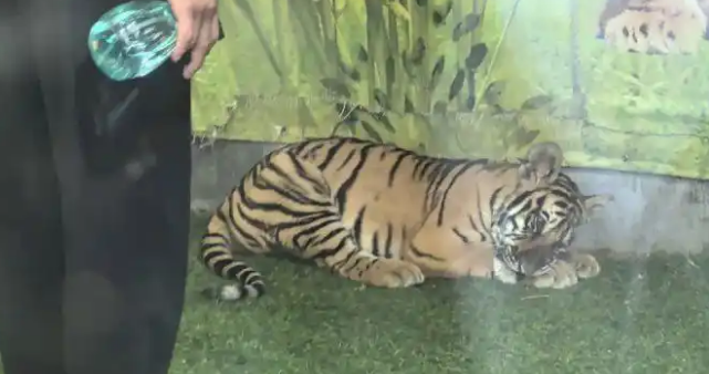 记者注意到,网友晒出了现场图片:工作人员手持着喷水壶,面对着地上的小老虎,小老虎趴在地上,耷拉着脑袋很不情愿的神情。