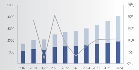 根据派读宠物《2025年中国宠物行业白皮书》(以下简称《白皮书》),2015年至2024年,国内宠物市场规模年均复合增长率高达13.3%,显著高于同期GDP的平均增速;2024年,城镇宠物(犬猫)消费市场规模同比增长近7.5%,突破3000亿元大关,达到3002亿元,其中犬市场小幅增长4.6%,规模为1557亿元,猫市场同比增长10.7%,规模为1445亿元。按照《白皮书》预计,到2027年,城镇宠物(犬猫)消费市场规模将突破4000亿元大关,达到4042亿元,2015年至2027年的复合增长率可达12.6%。