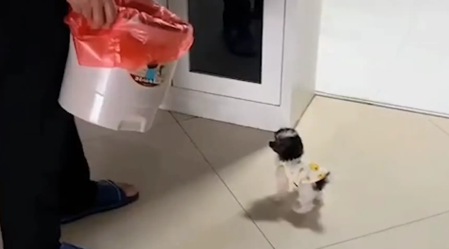 当时老爷子正套垃圾袋呢,冷不丁瞅见客厅中央多了个活物。您猜怎么着?那小狗许是吓傻了,四条小短腿跟钉在地上似的,脑袋耷拉着不敢抬。再瞧她爸,眼珠子都快瞪出来了——嘴巴张得能塞下个鸡蛋,活脱脱像尊会喘气的雕塑。