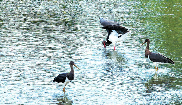 黑鹳对栖息地环境极为挑剔,仅选择水质澄澈、鱼虾丰沛的河流、湖泊及沼泽等湿地环境栖息。觅食时,它们常静立水中或滩涂良久,凭借超凡视觉锁定鱼类、两栖类或昆虫等猎物,随即以迅雷不及掩耳之势将长喙探入水中精准捕食,动作迅捷而优雅。